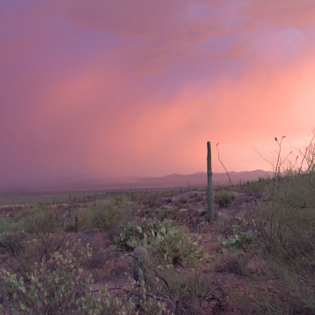 The sun caught the clouds at just the right angle to turn the majority of the sky bright pink with small opening where some blue poked through. This photo is cropped and the colors enhanced but only slightly. Way off in the distance you can just see the mountains that are, I believe, the western most ones on the Tohono O’Odham Nation Reservation. Though if someone else knows for sure, a comment would be appreciated. This arm-less saguaro seems to stand overlooking this valley. I’d be curious to know where this sunset ranks among all the sunsets it has seen.