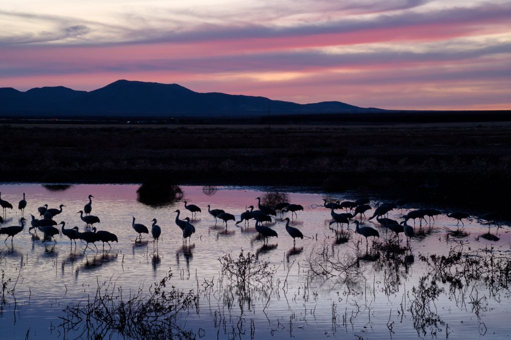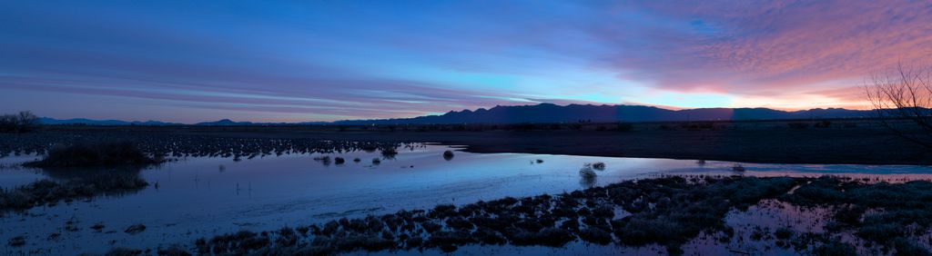 Finally this 7-shot pano. This was so early that each shot required many seconds at ISO 100 and I made the terrible error of taking them at different shutter speeds. The dynamic range here is vast and it may have been a good time for an HDR pano. The sky is blown out but in the original raw it’s a much smaller portion and the stitching software had to overexpose to get things to match. Poor implementation but I think the composition is okay. I like that the cranes are on the left (though I wish they were easier to see), and the sunrise on the right. It’s pretty but I wish I had executed better.