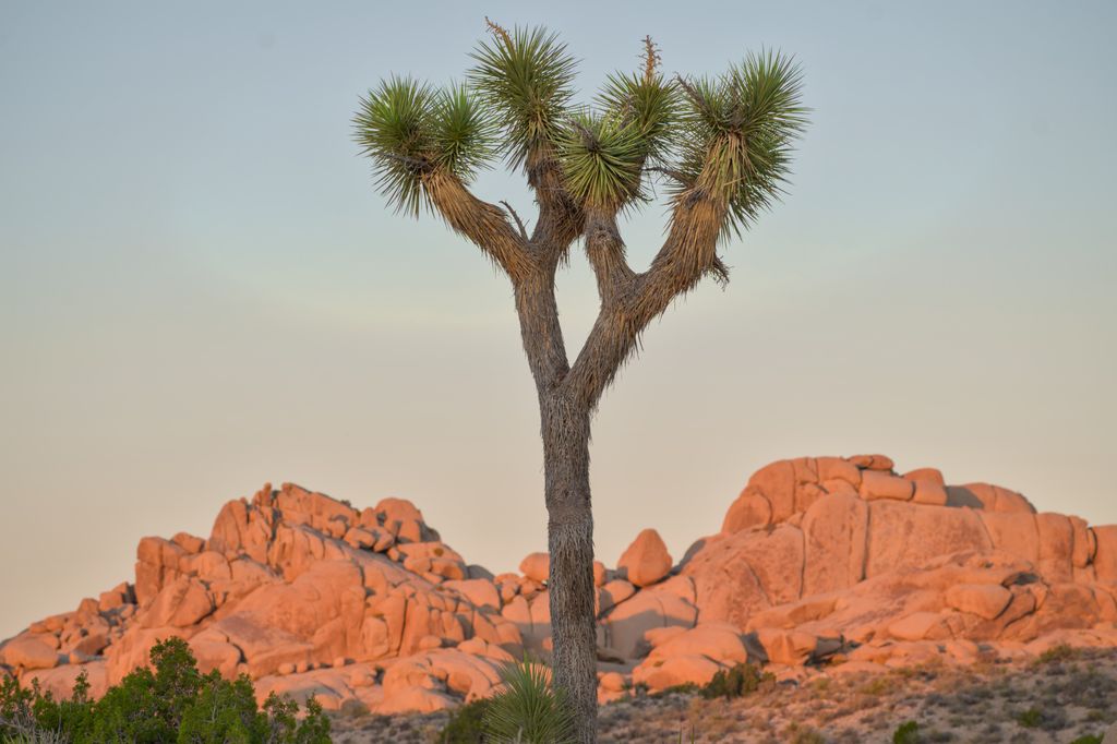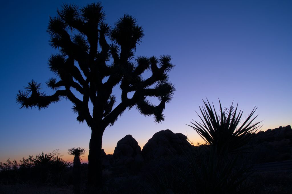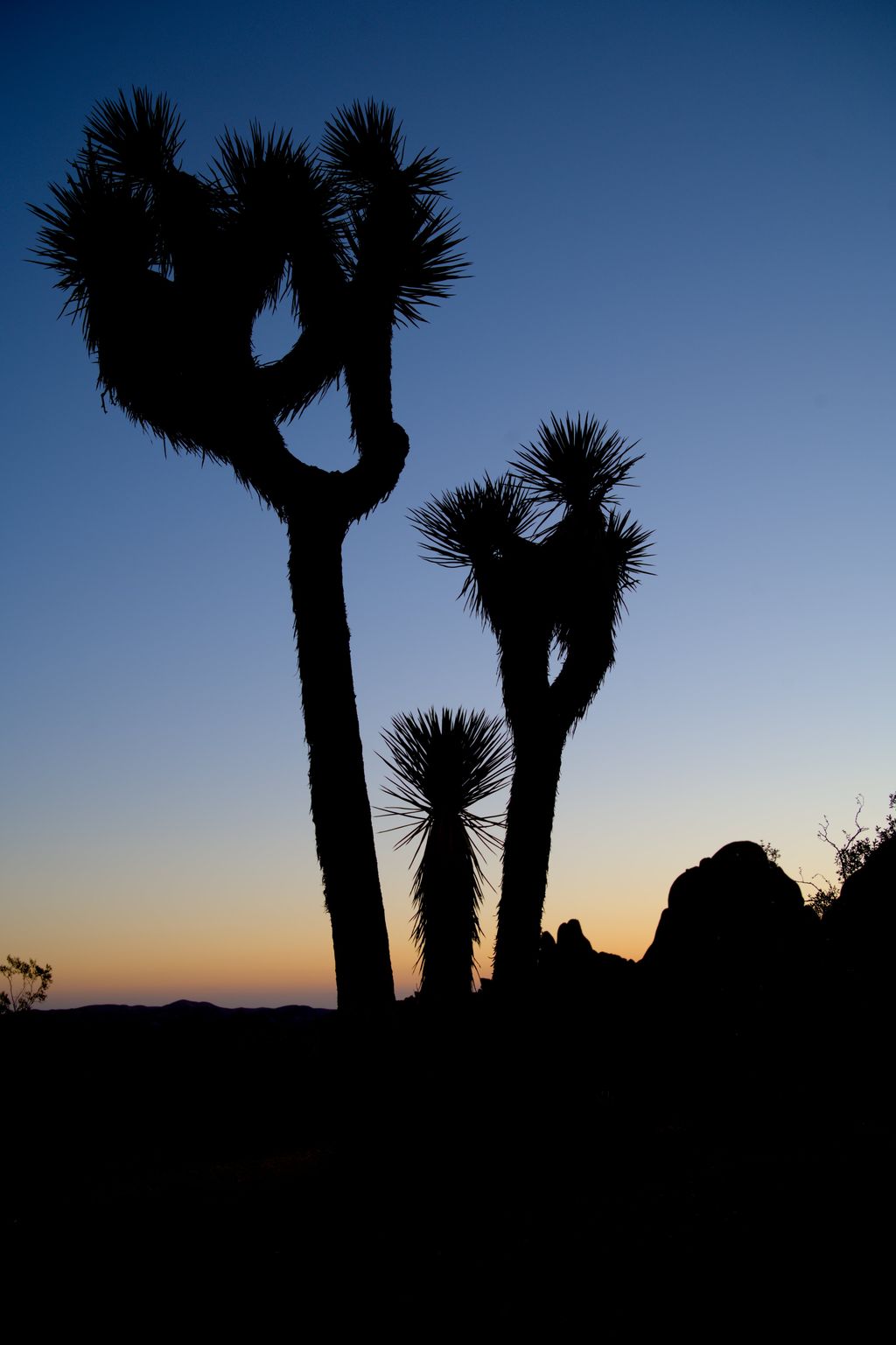 In the morning, I woke up before the rest of the family, per usual, and went to take some photos. I came up with a pair of silhouettes that seemed nice. I like this one for the variety of objects it contains. The Joshua Tree, pair of rocks, and two yuccas on the outside make for some visual interest that I enjoy.