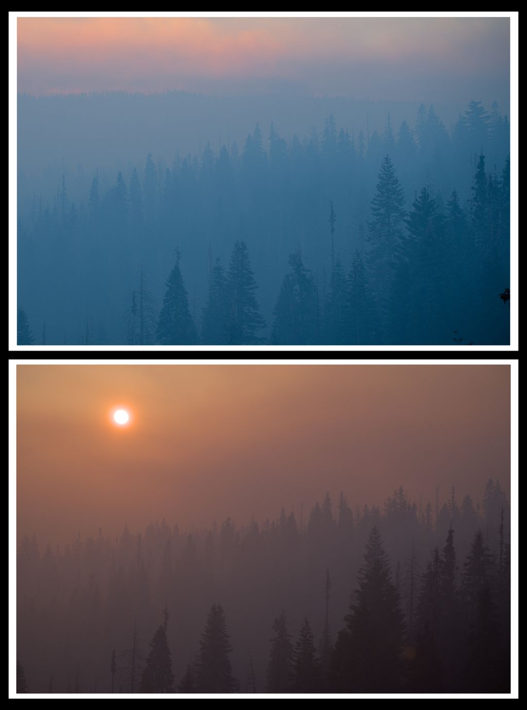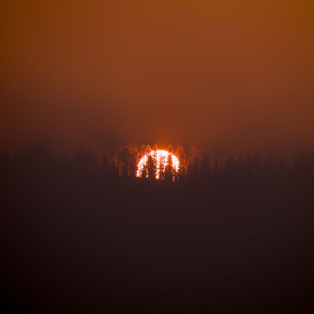 Lastly, the header photo. I went out one morning for sunrise photos to find the smoke so thick that a view of the sky was impossible. I tried to make the best of the light that was around but ultimately I had a hard time finding something interesting. I was about to head in when the sun poked over the mountain in the distance. Quickly I threw the camera on the tripod and maxed out the zoom. The photo is simple but I like how the branches look and how harsh the silhouette is.