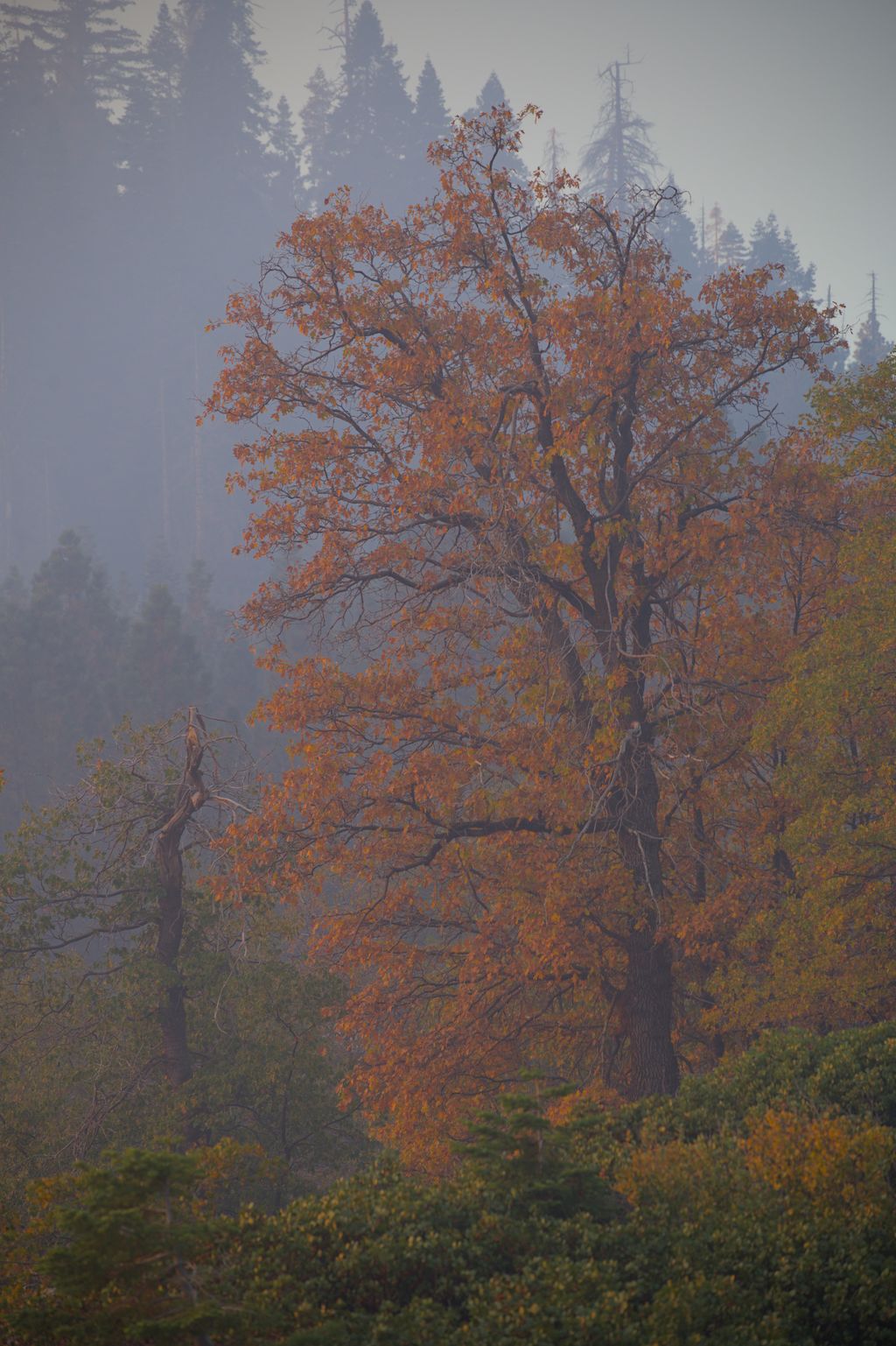 Here’s one from a smokey morning. The leaves on this tree were popping against the atmosphere. I’m not sure that I captured it very well. The fact that objects in the foreground are out of focus gives this photo some depth but I don’t think it’s necessary given the rest of the scene. It would’ve been better to keep all of it in focus, I think.
