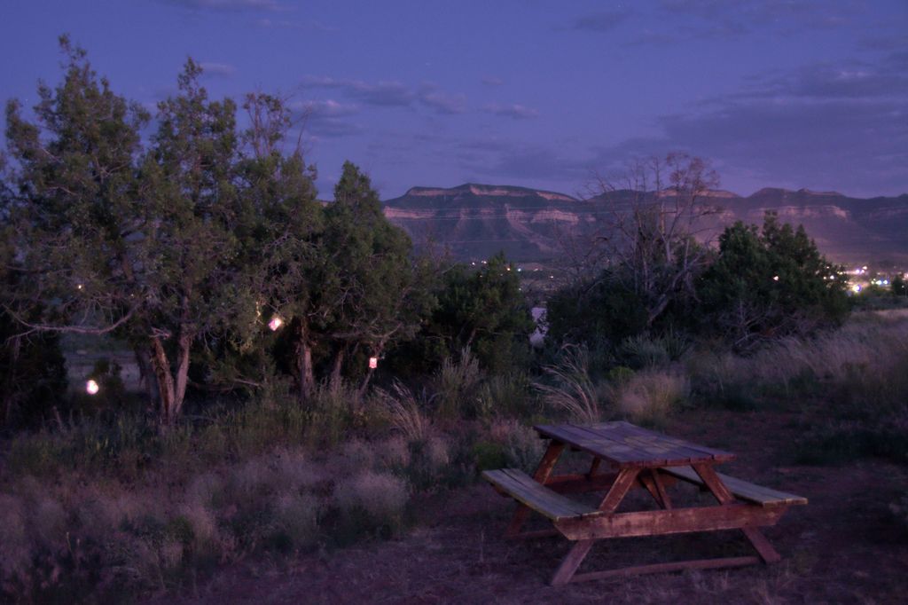 Before leaving Colorado we stopped at a little place called Yellow Car Winery. They have quite a large repertoire of fruit wines. The owner greeted us and promptly retrieved a large box of toys for the kids which meant that we had an hour, or so, of uninterrupted wine tasting and visiting with other travelers. Our host had a few RV sites with picnic tables for overnight patrons (or perhaps those who found themselves over imbibed). I took this photo in pretty dark light (as exhibited by the 1” exposure). The sun had gone down and I was playing around with camera settings. The table with the lights in the trees makes a nice foreground for the naturally supplied background of Cortex, CO. I wish there were no phone lines and that my post-processing skills were better on this one.