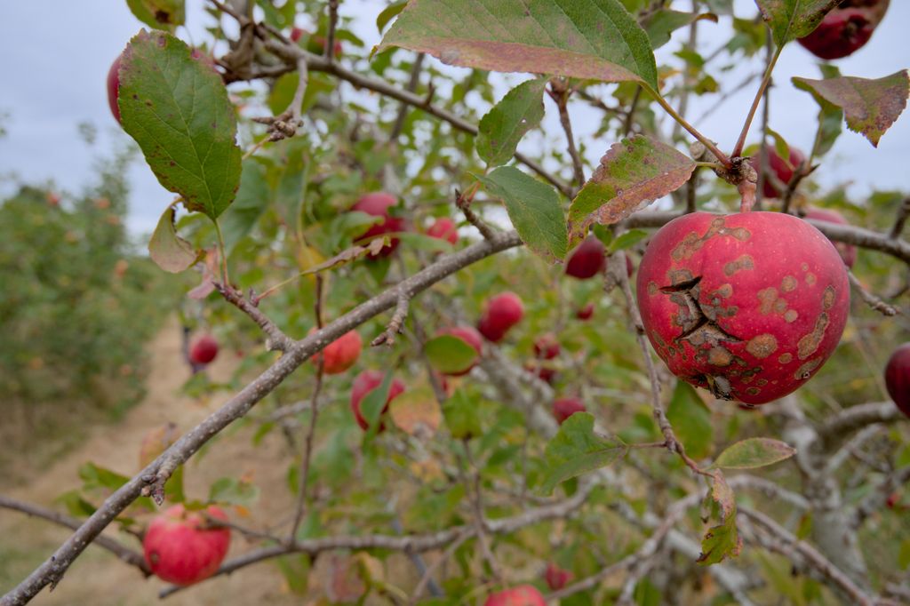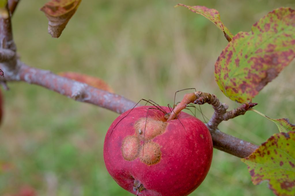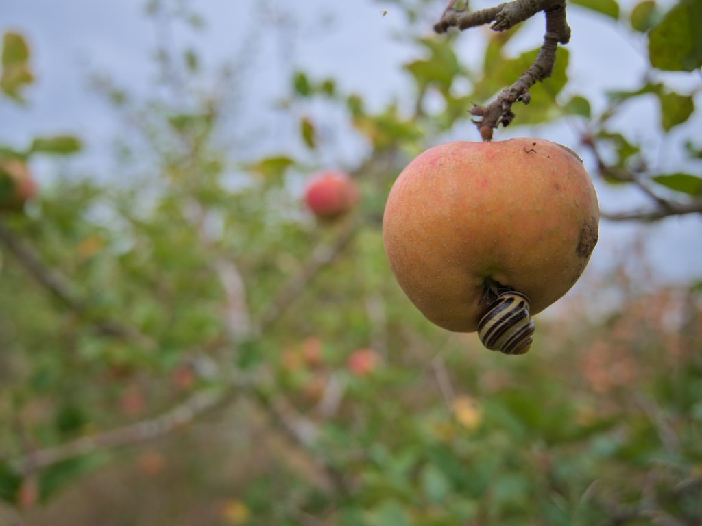 The variety of types of grapes and apples was more than I could keep track of. I was, however, able to pinpoint Jupiter grapes as my favorite grape on the farm. They were ripe and quite sweet! God’s creatures were also in attendance this day. I found a wasp getting drunk off fresh grape juice. A macro lens would’ve been fun for this shot. If you zoom in the hairs on his bum are visible. I also found a snail who had climbed up to partake of this orangeish-pink apple as well as a daddy long-legs resting on this bright red one with some apple scab. Limited apple scab like this doesn’t affect the taste.